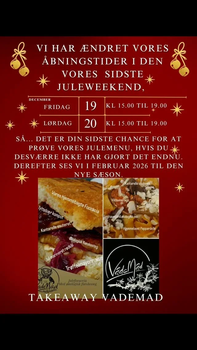 Vi har frisk hjemmelavet lasagne med vores VadeMad kødragù, eller hokkaido Vegetar Lasagne med ricotta,spinat og græskarcreme, hjemmelavet pasta lavet med økologiske æg, bechamelsauce med økologisk mælk. De kan tages med til ovnen derhjemme i portioner .
